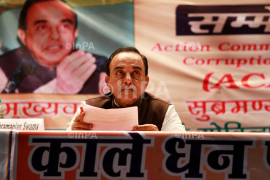 Janata Party President Subramanian Swamy during an event against corruption in New Delhi, India, Saturday, Feb. 4, 2012. Judge OP Saini dismissed Swamy's petition plea for trial of Home Minister P Chidambaram along with former telecommunications minister A Raja who was forced to resign last year because of a multibillion-dollar telecoms scandal and later arrested by police. Two days ago, India's top court ruled that the 122 licenses granted in the 2008 deal be scrapped. Photo Credit: Indian Photo Agency