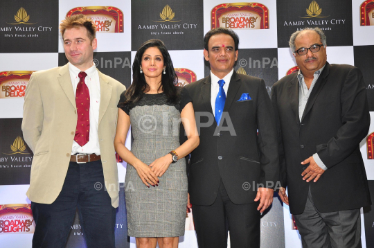 Guy Ongley, Deplidge International Production House, UK, Bollywood actress Sridevi, Vivek Kumar, CEO, Aamby Valley City and Bollywood Film producer Boney Kapoor during the launch of Aamby Valley Broadway Delights in Mumbai, India on February 06, 2013. Photo Credit: Indian Photo Agency (InPA)