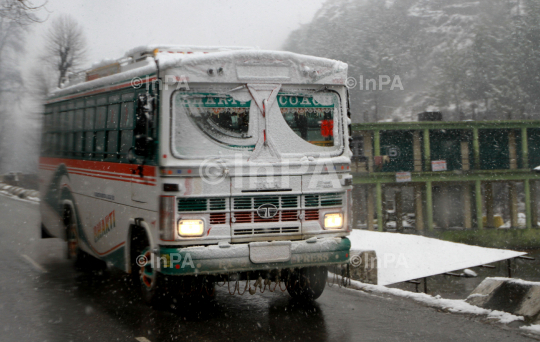 A bus during fresh snowfall in Manali, Himachal Pradesh, India on 08/02/2012. Manali at altitude of 1,950 m (6,400 ft) in the Beas River valley is an important hill station in the mountains of Himachal Pradesh, India, near the northern end of the Kullu Valley. It is located about 250 km (160 mi) north of state capital, Shimla. Photo Credit: Indian Photo Agency