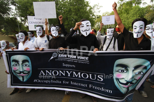 Wearing 'Guy Fawkes' masks, the Indian arm of international hackers' group 'Anonymous', during protest against censorship on the Internet at Jantar Mantar in New Delhi on Saturday, June 09, 2012. Photo Credit: Indian Photo Agency