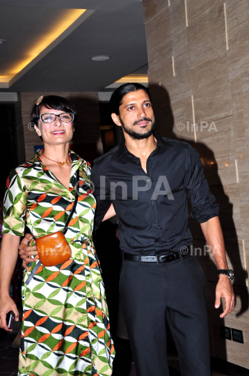 Leading hairstylist Adhuna Akhtar with her husband & director-actor-singer Farhan Akhtar, at success party of film Talaash at JW, Juhu in Mumbai, India on December 08, 2012. Photo Credit: Indian Photo Agency