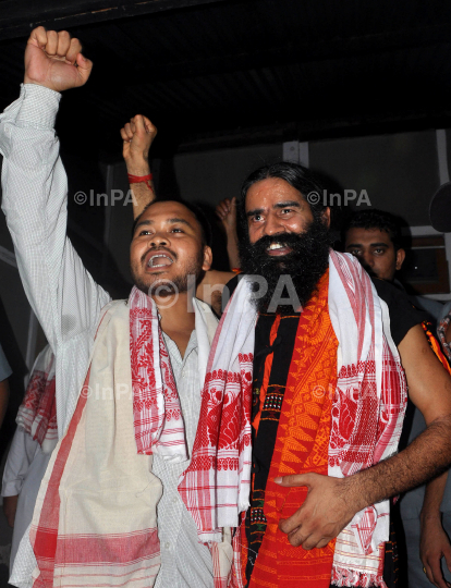 Yoga guru Baba Ramdev and Akhil Gogoi general secertary of Krisak Mukti Sangram Samiti (KMSS) while addressing media in Guwahati on Thursday 12th July 2012. Photo by Dasarath Deka/Indian Photo Agency