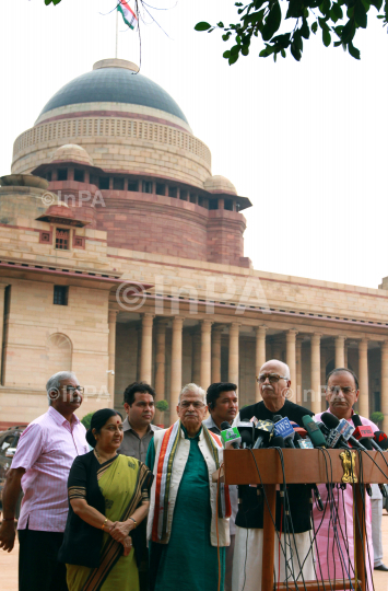 BJP leaders L K Advani, Sushma Swaraj, Arun Jaitley, Murli Manohar Joshi speaks to media after meeting with President of India Pranab Mukherjee in President House (Rashtrapati Bhavan), in New Delhi on September 12, 2012. They urged him to guide the government to cancel the coal block licenses allotted to 142 private players between 2006-09, the period scrutinized by the Comptroller and Auditor General (CAG), and to constitute a Commission of Inquiry headed by a sitting Supreme Court judge. Photo Credit: Indian Photo Agency