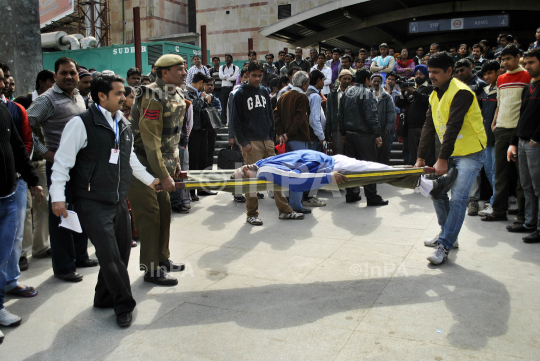 Civil defence volunteer and policeman carry out a man on stretcher during a mock drill in New Delhi February 15, 2012. The drill was conducted by the National Disaster Management Authority and the Delhi Disaster Management Authority to check the alertness and preparedness of various agencies in the wake of a major earthquake in the capital, local media reported. Photo By Rahul Karan/Indian Photo Agency