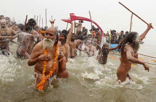 Naked Naga Sadhus, or a Hindu holy men take the royall Bath (Shahi Snan) on the occassion of 'Basant Panchami', at the Sangam, the confluence of rivers Ganges, Yamuna and mythical Saraswati, as part of the Maha Kumbh festival or Maha Kumbh Mela, in Allahabad, Uttar Pradesh, India, on Feb 15, 2013. Millions of Hindu pilgrims are expected to take part in the large religious congregation of a period of over a month on the banks of Sangam during the Maha Kumbh festival in January 2013, which falls every 12th year. Photo Credit: Indian Photo Agency (InPA)