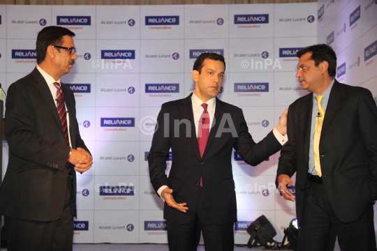 (L to R) Gurdeep Singh, Chief executive Officer, Wireless Business, Reliance Communications Rajeev Singh Molares, Presidant, Asia-Pacific with Munish Seth, President and Managing Director, Alcatel-Lucent india during the press conference of Reliance Communication (RCOM) and Alcatel - Lucent in Mumbai, India on January 16, 2012. Photo Credit: Indian Photo Agency