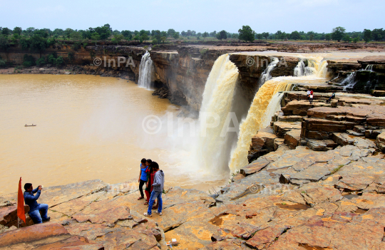 Travel: A tourist takes pictures of his friends at Chitrakot waterfalls or chitrakoot waterfalls or Chitrakut falls on the Indravati River near Jagdalpur, in Bastar district, Chhattisgarh, India on July 16, 2012. Photo Credit: Indian Photo Agency