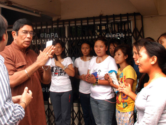 Congress Secretary Oscar Fernandes meeting with the Students from the Northeast in Mangalore on Aug 18, 2012. Oscar Said "The attack threats are just rumours being spread by unscrupulous elements. There is no need to rush back to your home towns. We ensure your safety here, nobody can touch you". The government on Friday banned bulk SMS and MMS messages for 15 days in view of the exodus of people from the northeast from cities like Bangalore, Pune and Hyderabad following rumors that they would be attacked. Photo by RK Bhat/Indian Photo Agency