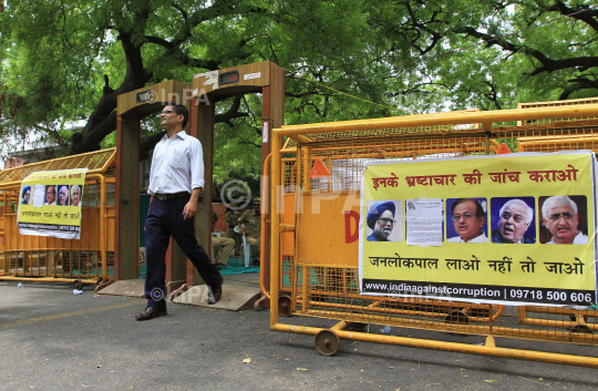 A supporters of Anti-corruption activist Anna Hazare walks as a poster with pictures of Prime Minister Manmohan Singh and ministers P Chidambaram, Kapil Sibal, Salman Khurshid demanding probe by an independent Special Investigation Team during a protest in New Delhi on July 25,2012. Campaigning for a strong Lokpal Bill, close aides of anti-corruption activist Anna Hazare have started an indefinite fast to protest against the government with 75-year-old Anna planning to join the hunger strike from July 29 owing to poor health. Photo Credit: Indian Photo Agency