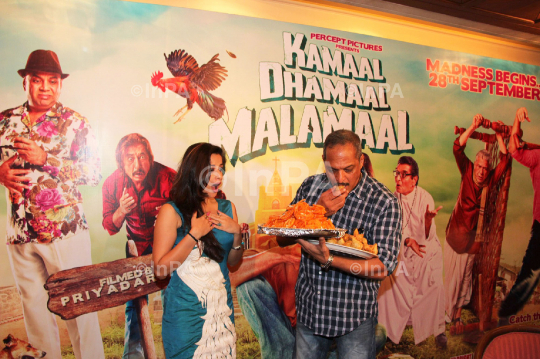 Bollywood actor Nana Patekar, actress Madhhurima at a promotional event for Percept Pictures' Kamaal Dhamaal Malamaal to release on 28 Sept in Mumbai on September 27, 2012. Photo Credit: Indian Photo Agency