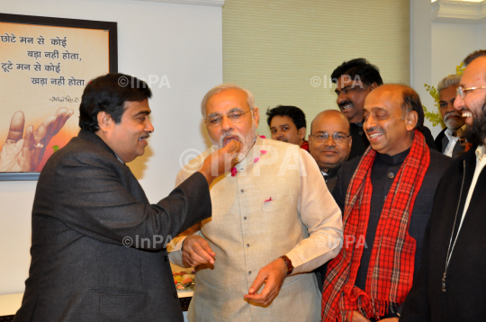 Gujarat Chief Minister, Narendra Modi felicitated by BJP President, Nitin Gadkari in New Delhi, India on December 27, 2012. Photo Credit: Indian Photo Agency