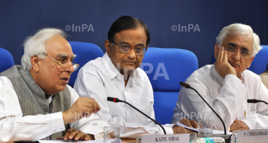 LtoR: Union Ministers for HRD and Telecom Kapil Sibal, Union Minister for Finance P Chidambaram and Union Law Minister Salman Khurshid addressing a press conferencce in India i in New Delhi on September 28, 2012. Photo Credit: Indian Photo Agency