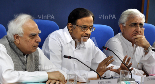 LtoR: Union Ministers for HRD and Telecom Kapil Sibal, Union Minister for Finance P Chidambaram and Union Law Minister Salman Khurshid addressing a press conferencce in India i in New Delhi on September 28, 2012. Photo Credit: Indian Photo Agency