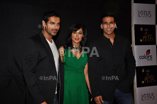 Actors John Abraham, Chitrangada Singh, Akshay Kumar during Colors Golden Petal awards at film city, Mumbai on 21/11/2011. Photo Credit: Indian Photo Agency