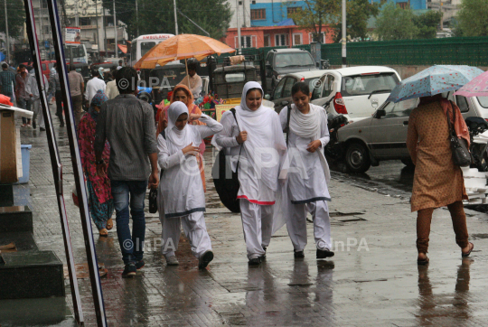 Kashmiri college girls walk during rain in Srinagar, Kashmir, India on August 4, 2012. Photo by Tariq Mir/Indian Photo Agency