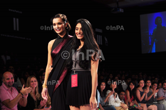 Fashion designer Pernia Quereshi with Bollywood actress Amy Jackson during the Lakme Fashion Week 2012 Winter/Festive, in Mumbai, India on August 4, 2012. Photo Credit: Indian Photo Agency