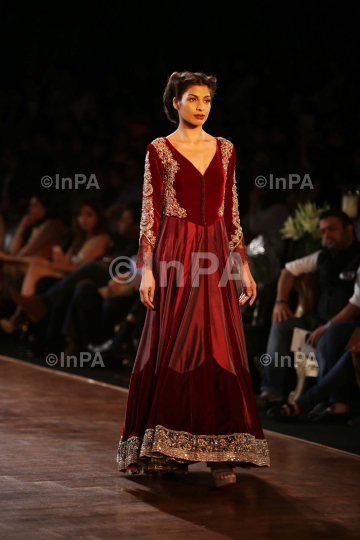 A model walks the ramp for Fashion designer Manish Malhotra during PCJ Delhi Couture Week 2013 in New Delhi, India on Aug 04, 2013. Photo Credit: Indian Photo Agency (InPA)