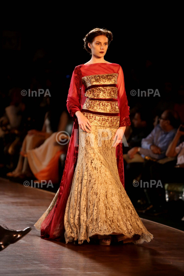 A model walks the ramp for Fashion designer Manish Malhotra during PCJ Delhi Couture Week 2013 in New Delhi, India on Aug 04, 2013. Photo Credit: Indian Photo Agency (InPA)