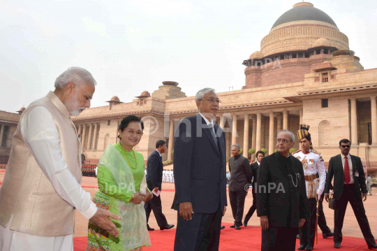 Myanmar's President Htin Kyaw and his wife Su Su Lwin with Prime Minister Narendra Modi and President Pranab Mukherjee during a ceremonial reception at the forecourt of the Indian president's palace in New Delhi, India, Monday, Aug 29, 2016. Photo Credit: Indian Photo Agency (InPA)