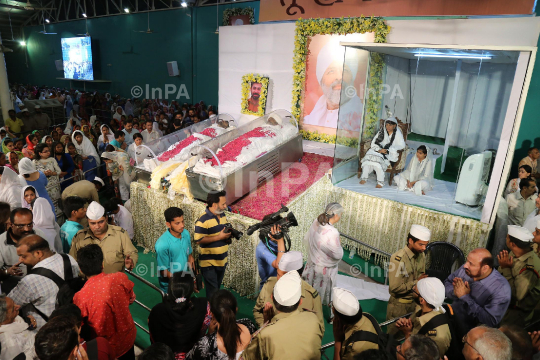 Devotees paying his last respects to Nirankari Baba Hardev Singh and his son-in-law Avneet's as his spouse Mata Sawinder Kaurat is also seen in picture at Nirankari Colony in New Delhi, India on May 05, 2016. Both were died in a road accident in Canada on Friday. The body of the spiritual leader was flown to Delhi from Canada's Montreal. Their bodies was then kept in west Delhi's Burari Road for the devotees to pay their final respects. Photo Credit: Indian Photo Agency (InPA)