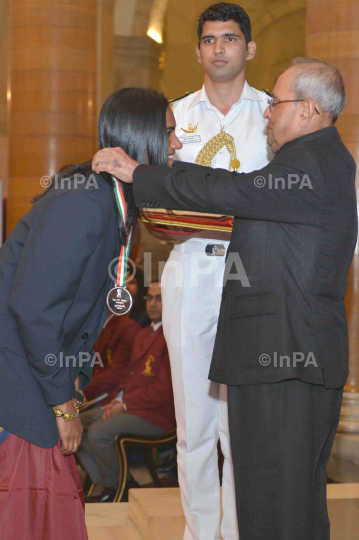 Olympic silver medallist, Badminton player P.V. Sindhu receives Rajiv Gandhi Khel Ratna Award from President Pranab Mukherjee in New Delhi, India, on Aug 29, 2016. Photo Credit: Indian Photo Agency (InPA)