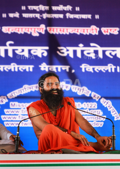 Indian yoga guru Baba Ramdev gestures as he sits during a protest in New Delhi on August 9, 2012. Tens of thousand of supporters from across the country poured into the capital Thursday to pledge their support to Baba Ramdev's anti corruption crusade and demanding the government bring back billions of dollars of illegal money stashed in foreign banks. Photo by Shweta/Indian Photo Agency