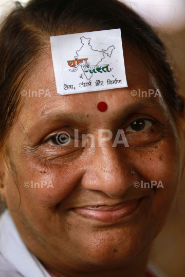 A supporter of Indian yoga guru Baba Ramdev has a sticker with an Indian map stuck on her forehead as she participates in a protest in New Delhi on August 9, 2012. Tens of thousand of supporters from across the country poured into the capital Thursday to pledge their support to Baba Ramdev's anti corruption crusade and demanding the government bring back billions of dollars of illegal money stashed in foreign banks. Photo by Shweta/Indian Photo Agency